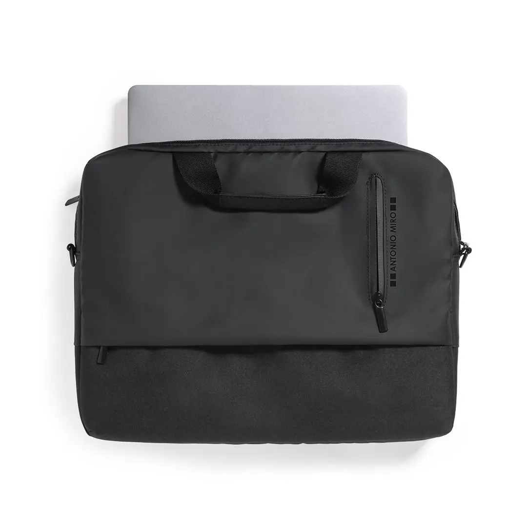 Najwyższej jakości aktówka Antonio Miró z odpornego poliestru 600D. Z stonowanym designem i wyściełaną przegrodą na laptopy o przekątnej do 15 cali. Z wygodnym wzmocnionym uchwytem do przenoszenia, zapięciem na suwak z metalowymi uchwytami i przednią kieszenią. Z przodu logo marki.