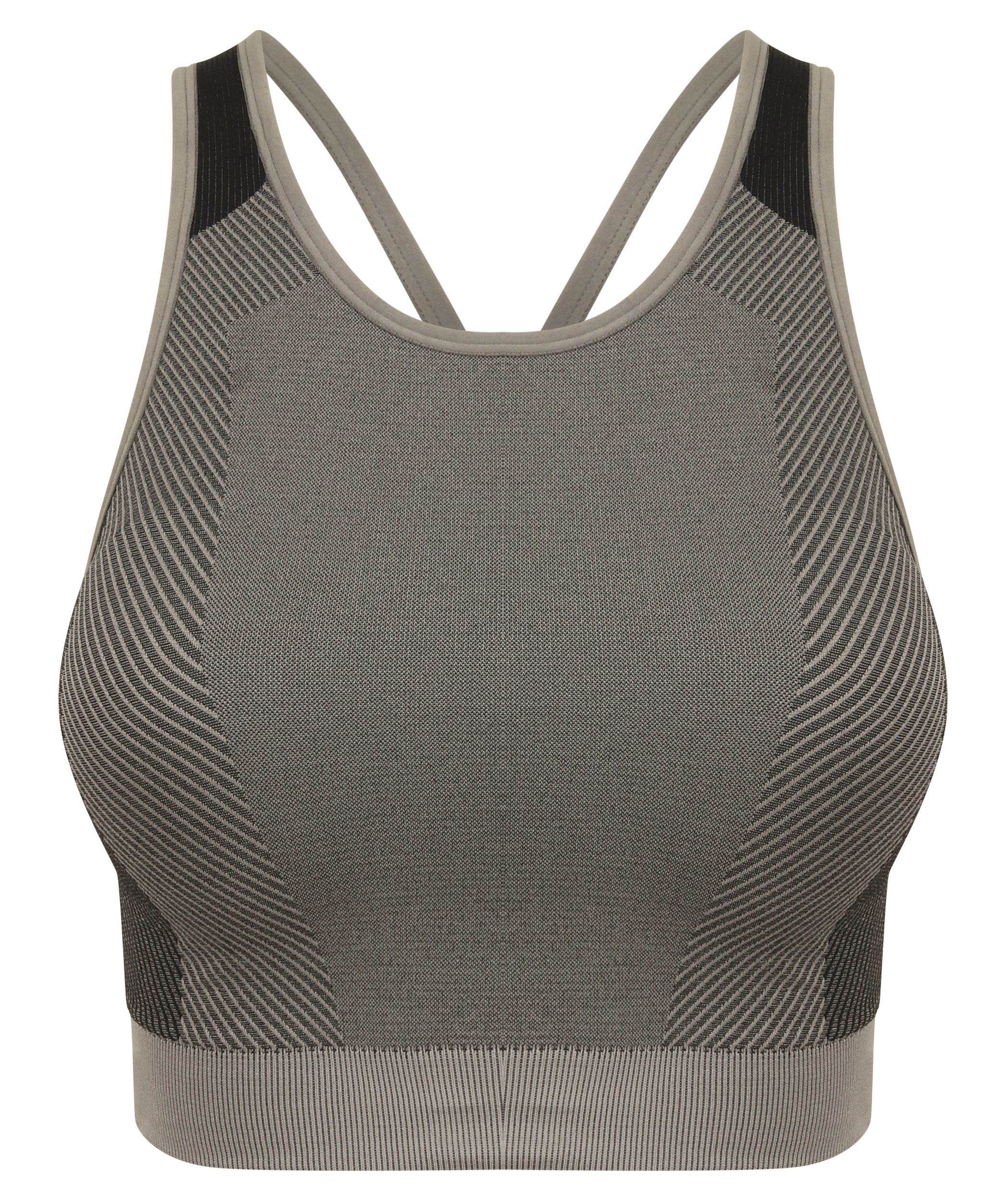 61% nylon /32% poliester / 7% elastan. Bezszwowy biustonosz z karczkiem. Tył typu racer ze skrzyżowanymi ramiączkami. Połącz z legginsami TL350. Elastyczny materiał dla optymalnego wsparcia. Wygodny i zapewniający dobrą mobilność.