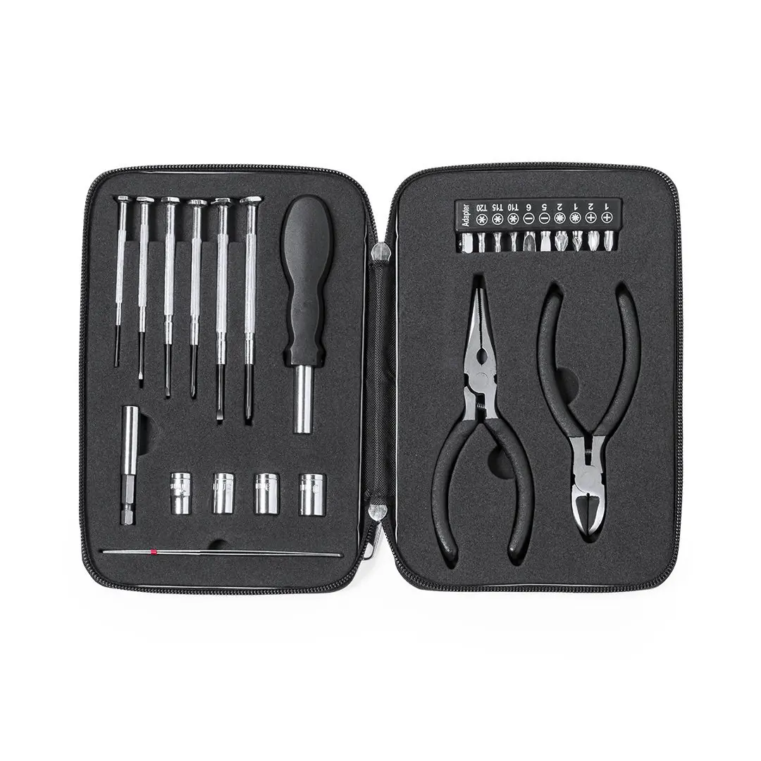 Zestaw narzędzi z 25 akcesoriami w wytrzymałej aluminiowej walizce z wyciętym wnętrzem z pianki EVA. W zestawie zestaw wkrętaków precyzyjnych, rękojeść wielofunkcyjna, wymienne bity, wkrętaki płaskie i gwiaździste. głowice rurowe. pęsety i szczypce. Pakowane w indywidualne pudełko.