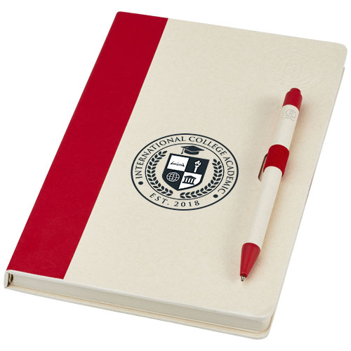 Zestaw z notatnikiem w formacie A5 i długopisem. Notatnik zawiera 80 kartek w linie (80 g/m²) wykonanych z poddanych recyklingowi kartonów po mleku (do 70%), grzbiet z kolorowego papieru i pętelkę na długopis. W pętelce na długopis znajduje się długopis na przycisk w dopasowanym do notatnika kolorze. Długopis ma korpus wykonany z tego samego materiału z kartonów mleka poddanych recyklingowi, a przycisk, klips i końcówka są wykonane z kolorowego tworzywa sztucznego PLA. W środku długopisu znajduje się czarny wkład. Zużyte kartony po mleku są zbierane, sortowane, przetwarzane i zamieniane w papier, co pozwala na przekształcenie odpadów w coś użytecznego.