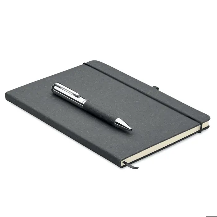 Zestaw upominkowy. Notatnik A5 z twardą okładką, wykonany w 75% ze skóry z recyklingu. Oprawiony. 160 stron w linie (80 kartek). Dopasowany elastyczny pasek zamykający, wstążkowy znacznik stron i uchwyt na długopis. Dopasowany metalowy długopis. Niebieski tusz. Zapakowany w papierowe pudełko.