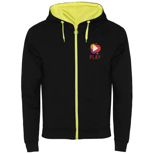 Bluza dresowa z nieszczotkowanego polaru z detalami we fluorescencyjnym kolorze. Centralny zamek błyskawiczny z kontrastowym uchwytem. Kaptur z podszewką z mikroperforowanej tkaniny poliestrowej w kontrastowym fluorescencyjnym kolorze. Sznurek i metalowe oczka w kontrastowym fluorescencyjnym kolorze. Mankiety i talia wykończone ściągaczem 1x1. Dwie kieszenie z przodu z szeroką lamówką. Wzmocnione kryte szwy na wewnętrznym kołnierzu. Usuwalna etykieta.