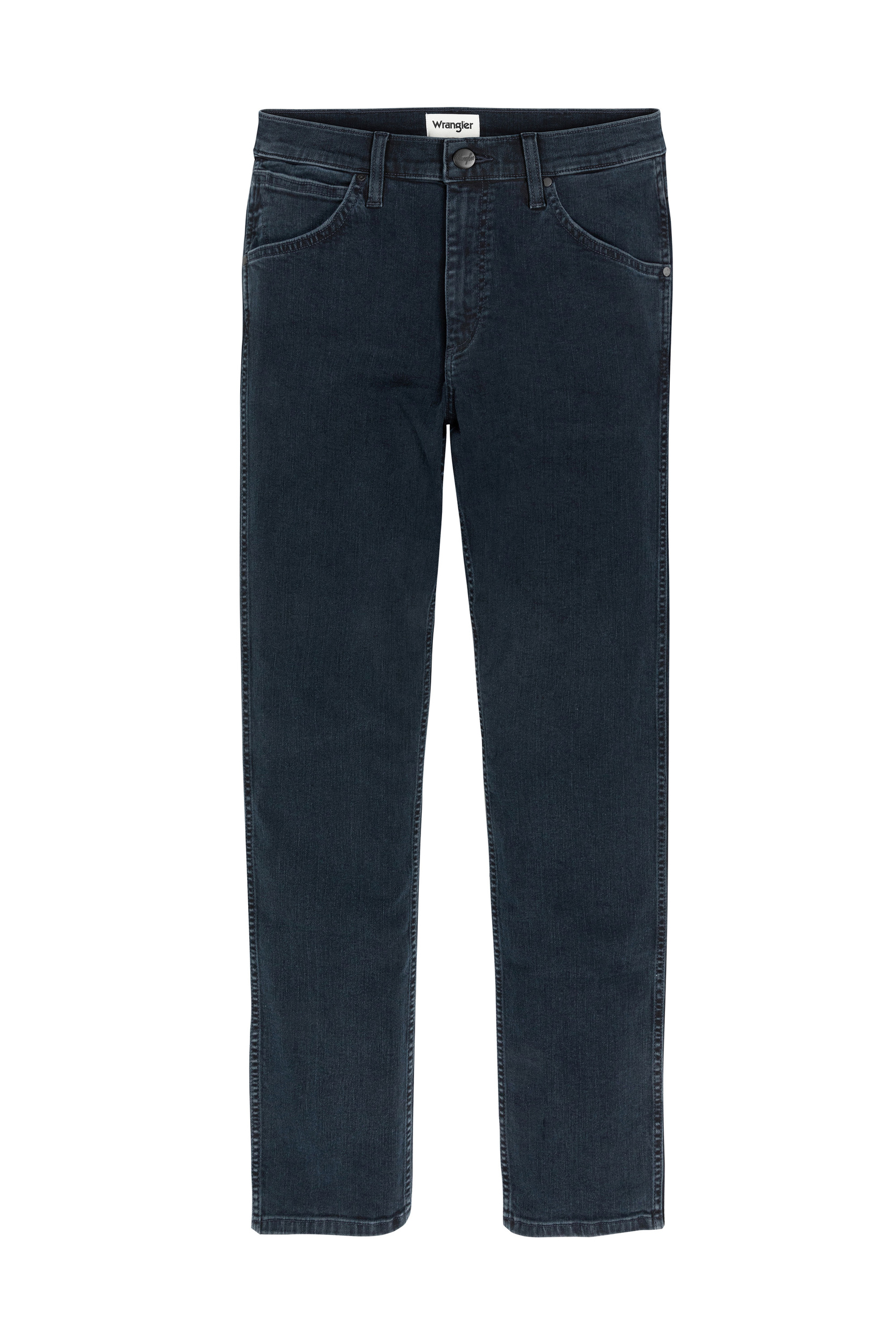 Elegancki i ponadczasowy dżins o klasycznym, prostym kroju. Beżowa skórzana naszywka Wrangler z tyłu.