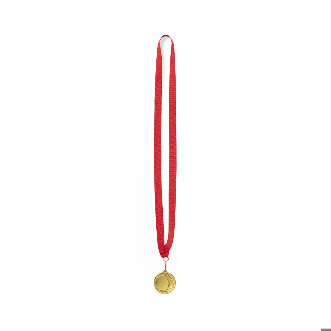 Metalowy medal z wytłoczonym złotym wykończeniem. Z czerwoną tasiemką poliestrową, dopasowanym metalowym karabińczykiem i specjalnie zaprojektowanym do znakowania laserowego.