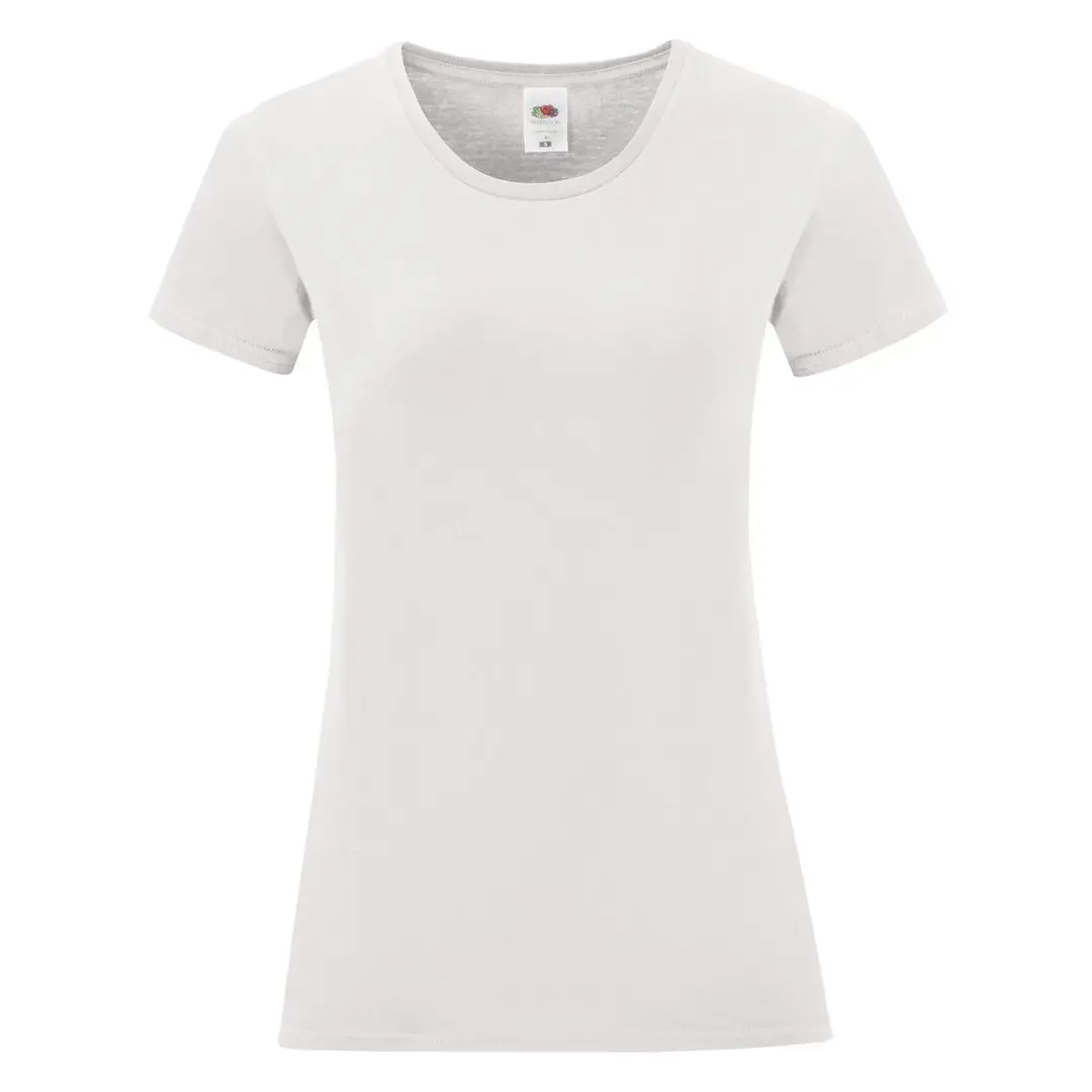 Fruit Of The Loom Kultowa biała koszulka damska. Wykonany w 100% z czesanej bawełny Ring Spun o gramaturze 140g/m2. Miękki w dotyku i dopasowany krój, z bocznymi szwami zaprojektowanymi dla idealnego dopasowania. Posiada wąski dekolt wykończony ściągaczem 1x1 i dopasowane zapięcie. Łatwo usuwalna metka i dostępna w rozmiarach XS, S, M, L, XL, XXL.