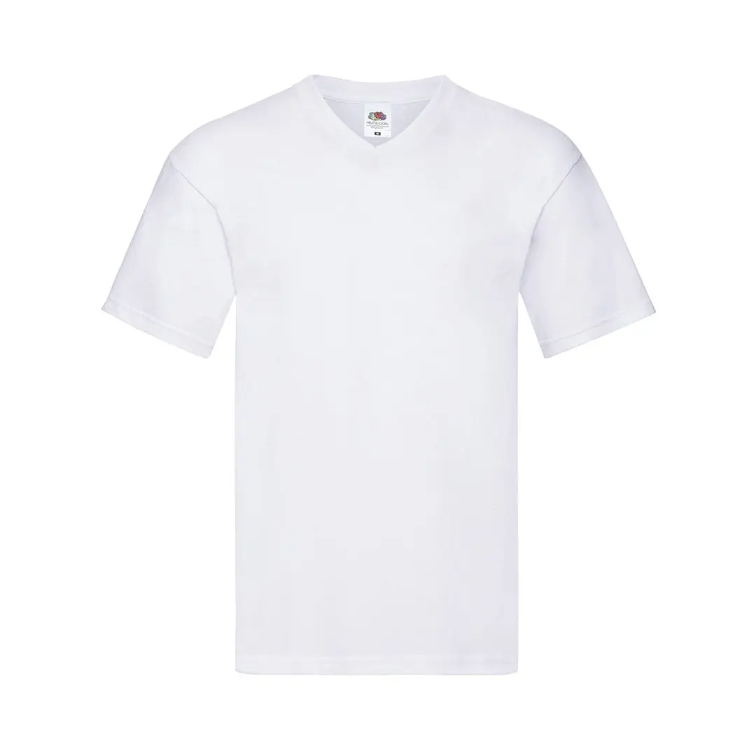 Fruit Of The Loom Kultowa biała koszulka z dekoltem w serek dla dorosłych. Wykonany w 100% z czesanej bawełny Ring Spun o gramaturze 140g/m2. Miękki w dotyku i nowoczesny krój, z wąskim, prążkowanym dekoltem w szpic 1x1 i dopasowaną plisą. Łatwo zdejmowana metka i dostępna w rozmiarach S, M, L, XL, XXL.