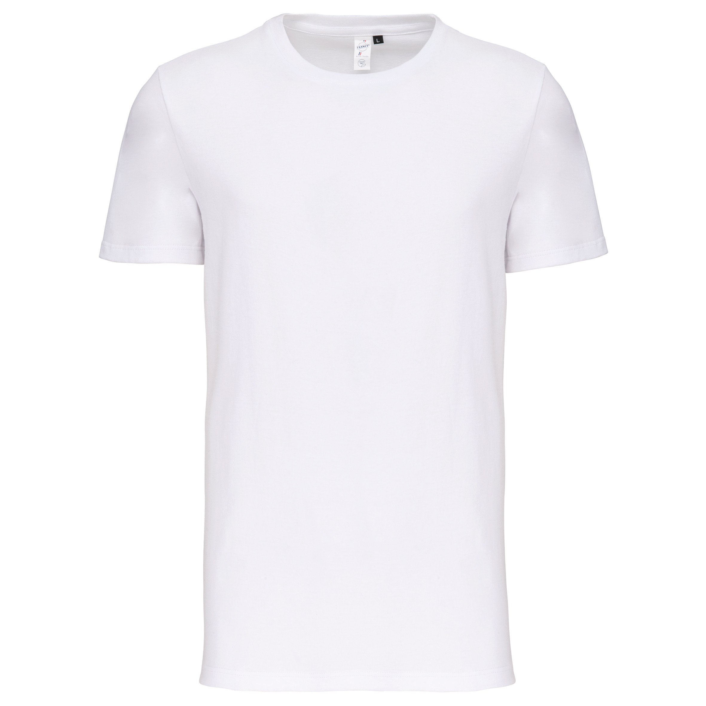 100% czesana bawełna organiczna. Etykieta „Gwarancja pochodzenia we Francji”. Wytnij i zszyj. Okrągły dekolt w prążki. Pasek ze szwem pokrywającym w tym samym kolorze na szyi i ramionach. Niebiesko-biało-czerwona metka na dole lewego rękawa. Wykończona podwójnym szwem na dole rękawa i ubioru. Opakowanie w 100% nadające się do recyklingu. 90% francuskiej produkcji, certyfikacja Origine France Garantie. Bawełna czesana: trwałość odzieży w czasie. Odzież wysokiej jakości, etyczna i szanująca środowisko.