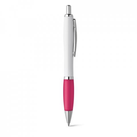 Długopis z klipsem i metalowymi detalami. Kolorowy antypoślizgowy uchwyt i biały korpus. Niebieski tusz.ø12 x 140 mm