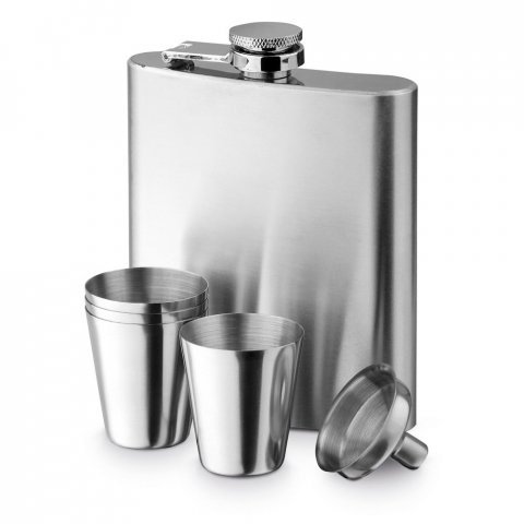 Zestaw - piersiówka (200 ml), lejek i 4 kieliszki o pojemności do 20 ml. Wykonany ze stali nierdzewnej. Dostarczany w pudełku prezentowym.189 x 40 x 168 mm