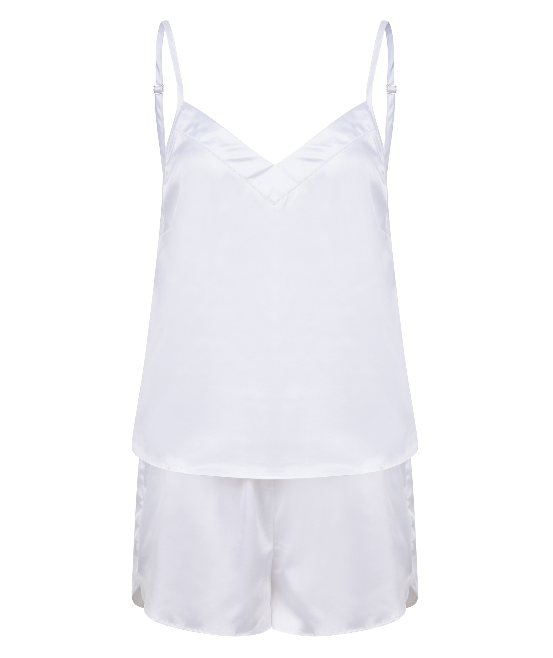 98% poliester, 2% elastan satyna. Szeroka bluzka z dekoltem w szpic i cienkimi regulowanymi ramiączkami. Szorty z gumką w pasie. Miękki i wygodny w dotyku. Regulowane ramiączka.