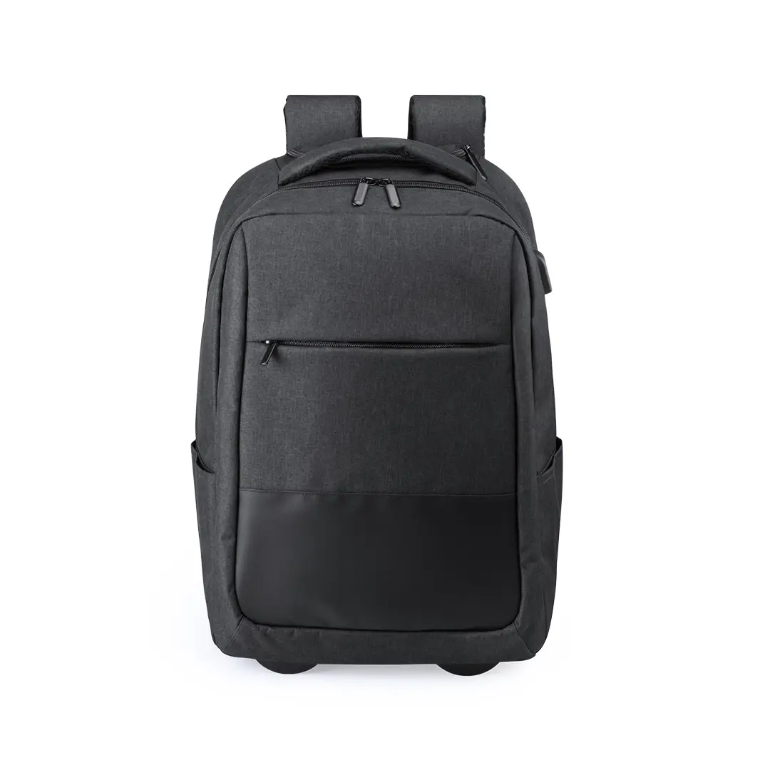 Plecak na kółkach z odpornego poliestru 300D. Z połączeniem USB - powerbank nie jest dołączony - i wyściełaną wewnętrzną kieszenią na laptopa do 15 cali i przegrodą na tablet do 10 cali. Kieszeń główna z podwójnym ściągaczem, kieszenie boczne i przednie. Komora na mechanizm wózka zapinana na zamek błyskawiczny, wzmocniona rączka i pokrowiec na koło z zapięciem na rzep. Wyściełany tył i regulowane wyściełane szelki. Plecak na kółkach Haltrix. Produkt wykonany z poliestru 300D. (Połączenie USB. Wyściełana kieszeń na laptopa. Wyściełane paski) Plecak na kółkach z odpornego poliestru 300D. Z połączeniem USB - powerbank nie jest dołączony - i wyściełaną wewnętrzną kieszenią na laptopa do 15 cali i przegrodą na tablet do 10 cali. Kieszeń główna z podwójnym ściągaczem, kieszenie boczne i przednie. Komora na mechanizm wózka zapinana na zamek błyskawiczny, wzmocniony uchwyt i pokrowiec na koło z zapięciem na rzep. Wyściełane plecy i regulowane, wyściełane paski na ramię Zaufaj firmie Muybuenaidea, liderowi sprzedaży od 15 lat, i zaskocz swoich klientów i pracowników dowolnym upominkiem promocyjnym zawartym w naszej szerokiej gamie produktów.