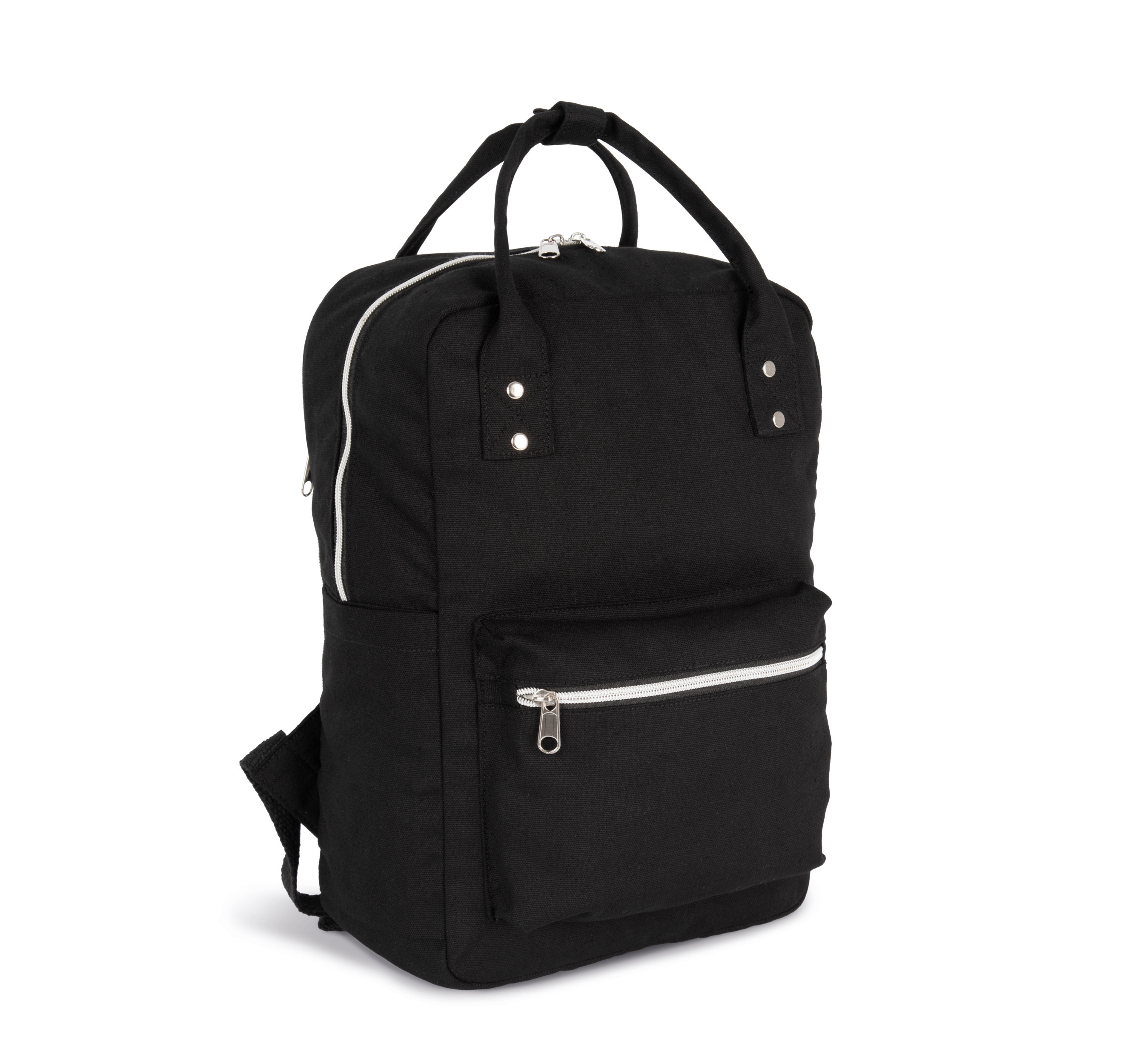100% bawełna. Bawełniany plecak z uchwytami do przenoszenia do wykorzystania jako torebka. Górny otwór główny i otwór dodatkowy z zamknięciem na zamek błyskawiczny. Przednia kieszeń zapinana na zamek. Kieszenie boczne, tył i wyściełane paski.