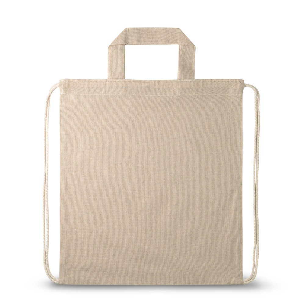 Worek z bawełny z recyklingu (140 g/m²), 30 cm rączkami i bawełnianymi sznurkami do zamykania.370 x 410 mm