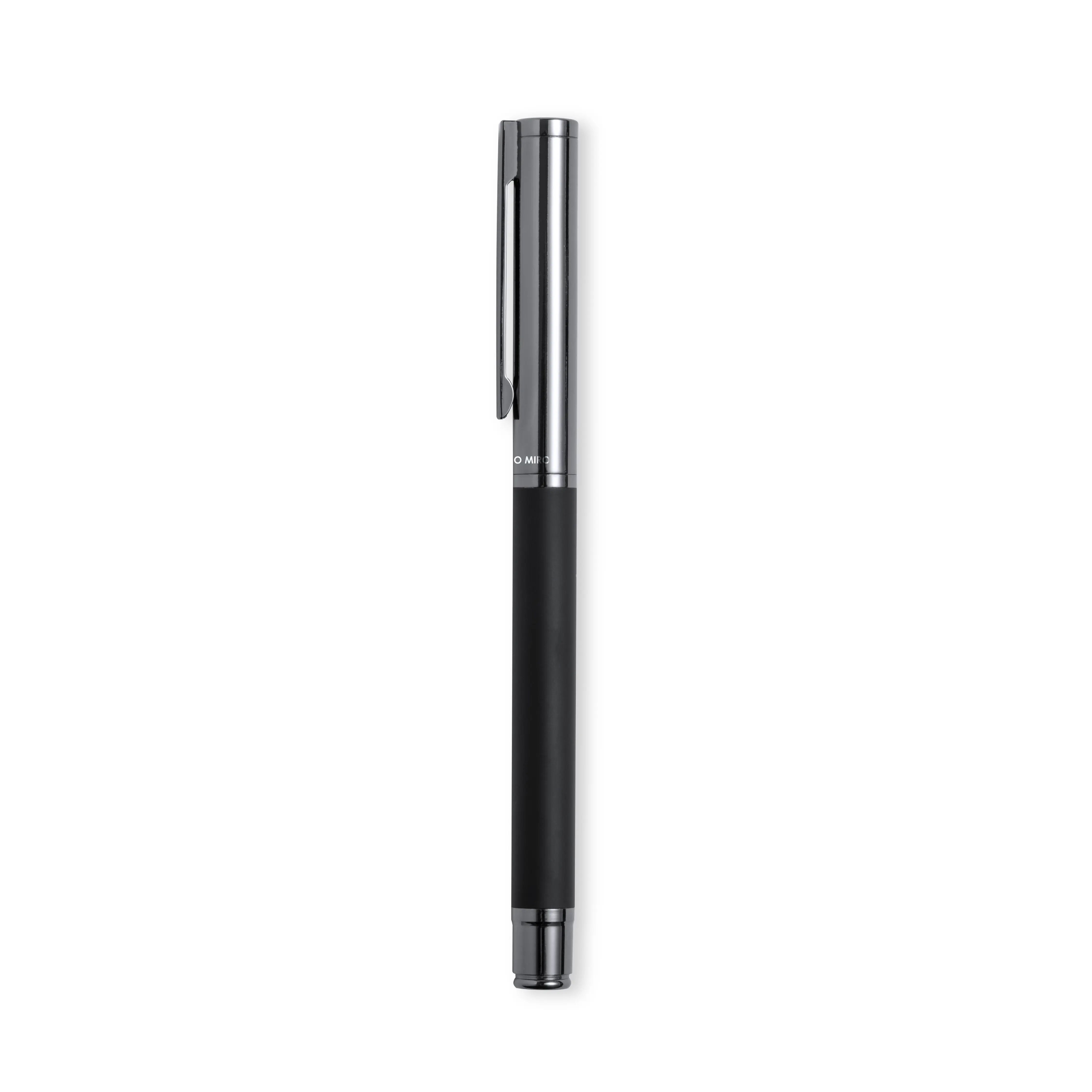 Roller de Antonio Miró fabricado en metal, con cuerpo en negro mate. Detalles y capucha en cromado con logotipo de la marca. De cartucho jumbo y en tinta azul. Presentado en elegante y resistente caja individual negra con logotipo Antonio Miró y funda a juego.