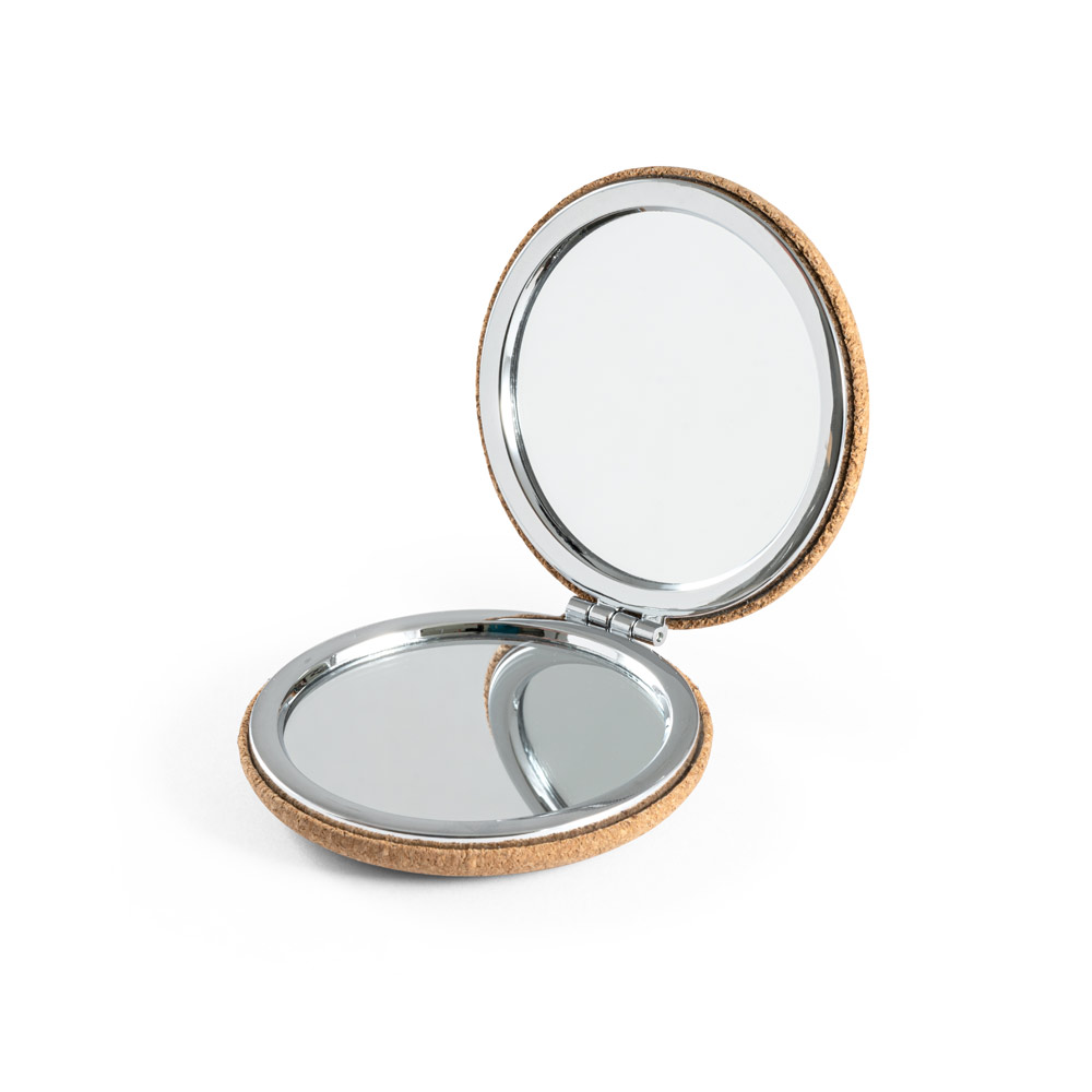 Podwójne okrągłe lusterko z korka z miękkim zamknięciem na magnes. Dostarczane w papierowym etui w kolorze naturalnym. ø73 x 20 mm